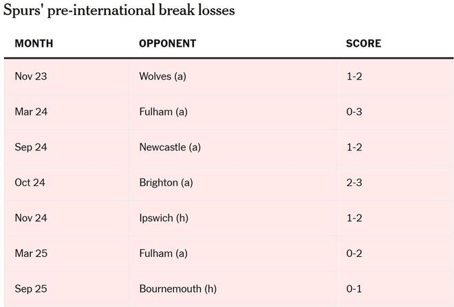 更令球迷不安的是,弗兰克似乎继承了前任波斯特科格鲁的一段“怪异魔咒”:据The Athletic统计,在国际比赛日前的最后一轮,热刺总是输球。从2023年11月客场1-2不敌狼队开始,到上个月主场0-1输给伯恩茅斯,热刺已经连续七次在国家队比赛前吞下失利。